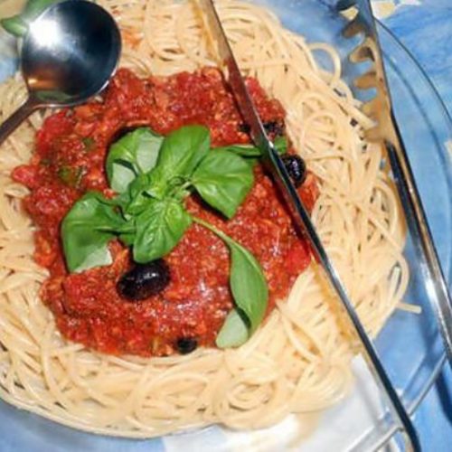 Maak de tonijn klein en voeg deze samen met de olijven toe aan de tomatensaus. Kook de spaghetti volgens de handleiding op de verpakking.