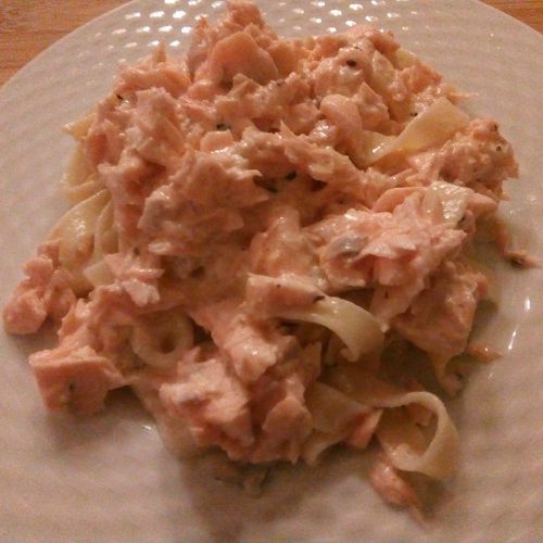 Haal de zalm uit de pan, verwijder het vel en maak klein door met 2 vorken uit elkaar te trekken. Doe de moten zalm in een pan en roer er de crème fraîche door. Doe dit op laag vuur zodat de crème fraîche zacht en vloeibaar wordt.