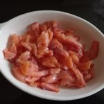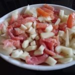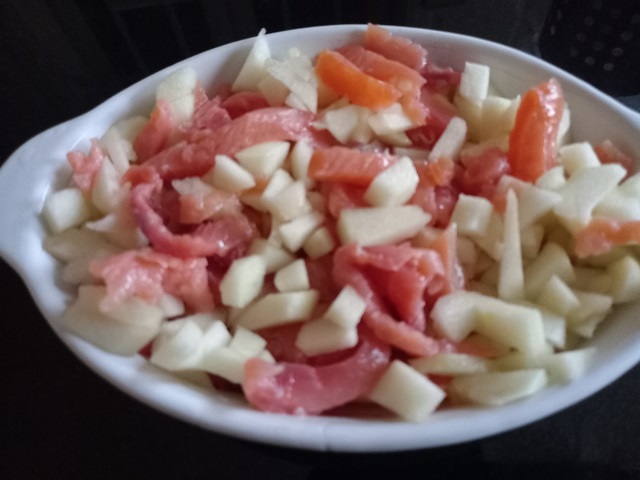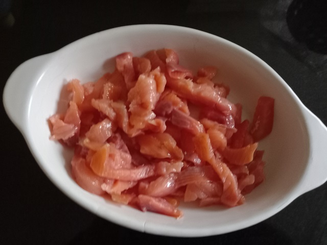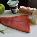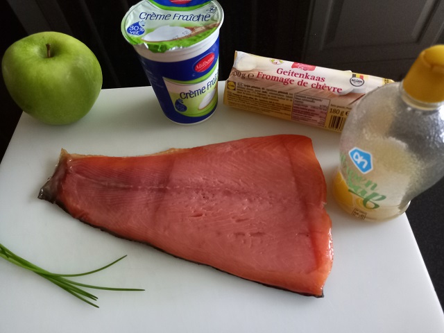 Snijd de zalm in stukjes. Schil de appel en snijd in kleine blokjes.