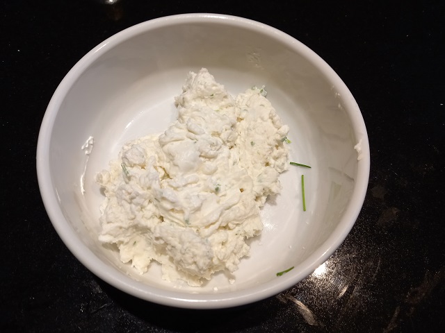 Meng in een kommetje de geitenkaas, bieslook en de crème fraîche.