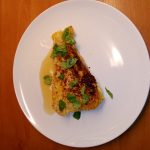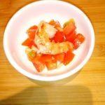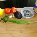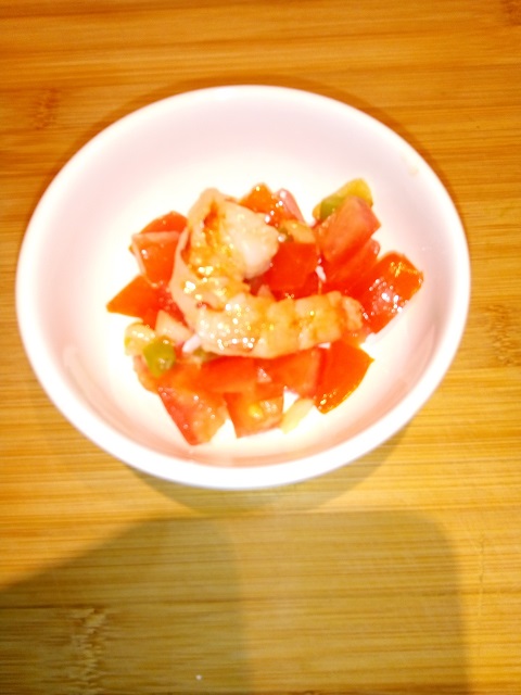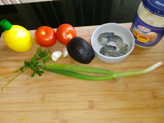 2. Doe een beetje olie in een koekenpan en fruit de bosui en de knoflook op laag vuur. Zet vuur iets hoger en bak de scampi’s aan beide zijden. Zodra deze mooi rose zijn, maar nog wel een beetje glazig, voeg dan de tomatenblokjes toe. Laat geheel afkoelen.