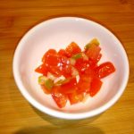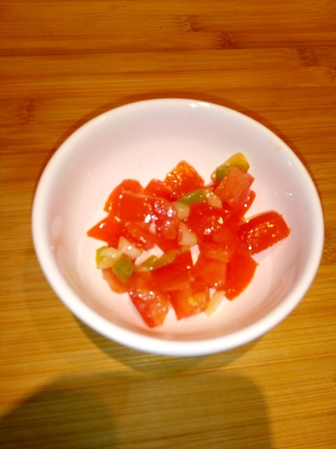1. Leg onderin elk schaaltje of glas een laagje van de tomatenblokjes.