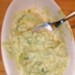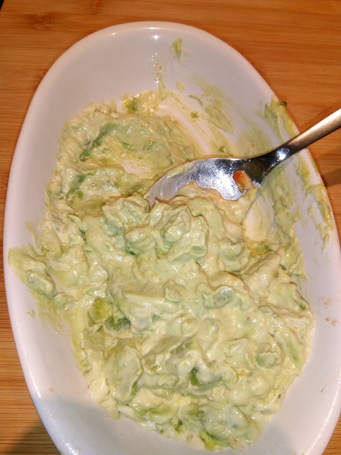 Snijd de avocado rondom in tot de pit. Draai de twee helften een kwart slag in tegengestelde richting. Trek van elkaar af en verwijder de pit. Haal met behulp van een lepel het vruchtvlees uit de schil. Doe dit in een kom, wrijf er met de lepel een mousse van. Besprenkel met het citroensap. Voeg de mayonaise toe en meng goed door elkaar. Breng op smaak met zout en peper. Ik gebruikte piment d’espelette. Heb je dit niet, gebruik dan cayenne- of gewone peper.