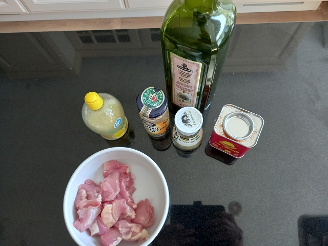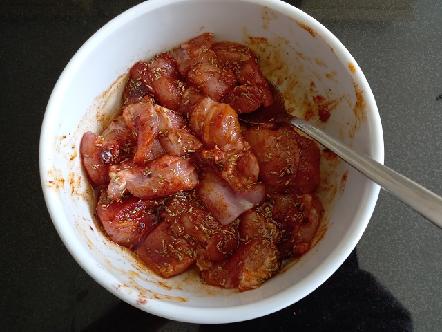 Snijd de kippendij in blokjes. Besprenkel met wat olijfolie. Bestrooi met citroensap, rozemarijn, paprikapoeder en piment d'Espelette. Meng goed door elkaar. Dek de kom af met een stukje folie en zet minimaal 30 minuten in de koelkast.