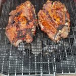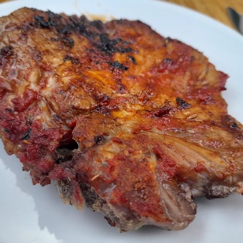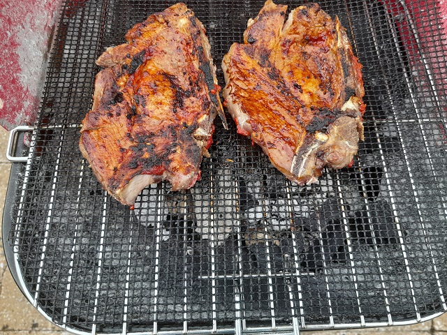 4. Leg de karbonades met de ingesmeerde kant naar beneden op de BBQ. Besmeer de andere zijde met de marinade. Gril de karbonades ongeveer 7 à 10 minuten per kant, afhankelijk hoe heet de BBQ is en de dikte van de karbonades.