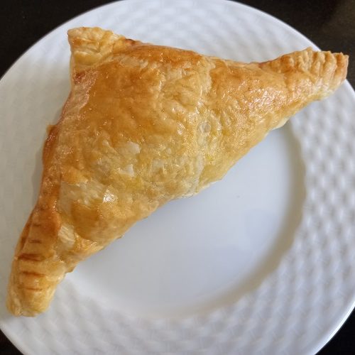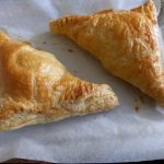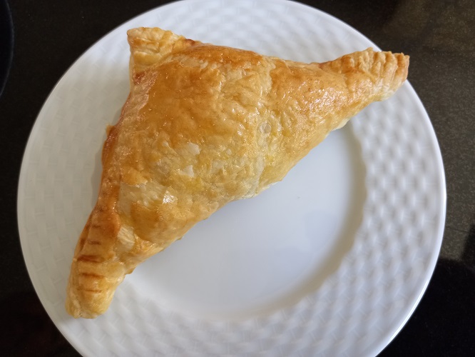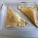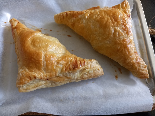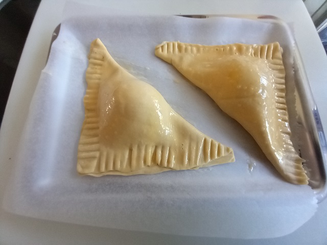 Vouw het bladerdeeg dicht. Druk de randen goed aan met de tanden van een vork. Leg op een plaatje bedekt met ovenpapier. Bestrijk het bladerdeeg met het los geklopte ei.