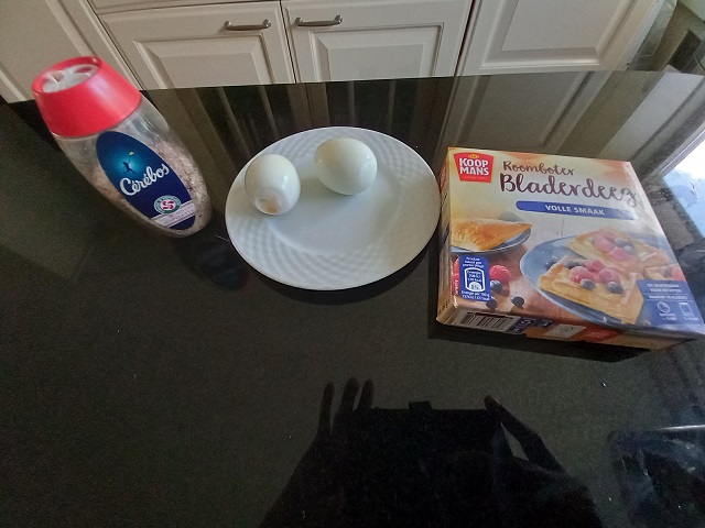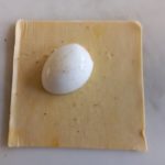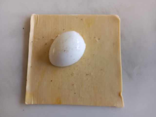 Zet alle ingrediënten klaar. Pel de hard gekookte eieren. Klop het andere ei los in een kopje. Laat ondertussen het bladerdeeg ontdooien.