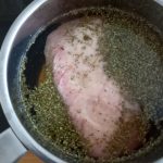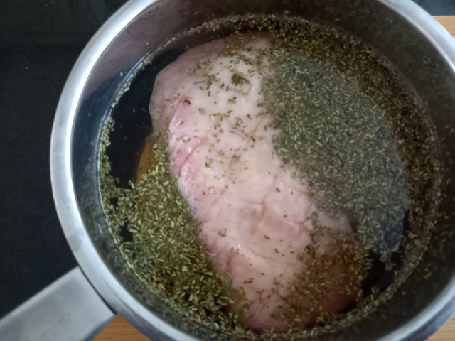 Zet alle ingrediënten klaar. Maak een pekelbad met het water, zout, tijm en rozemarijn door het geheel aan de kook te brengen. Roer tot het zout is opgelost. Haal van de warmtebron en laat afkoelen.