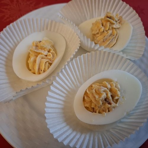 Doe het mengsel in de spuitzak en vul eiwitten. Garneer met wat peterselie. (staat niet op de foto).