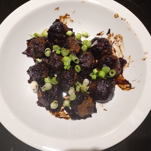 Verwarm de saus zodra de gehaktballetjes klaar zijn en rol deze door de saus. Leg ze op een bord en garneer met de fijn gesneden lente ui. Zet cocktailprikkers op tafel en serveer.