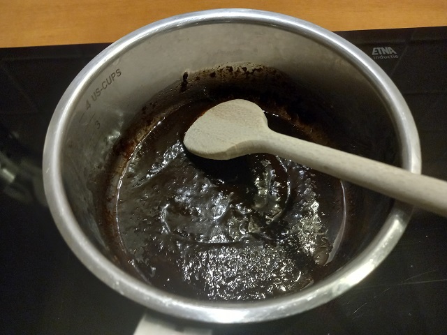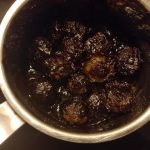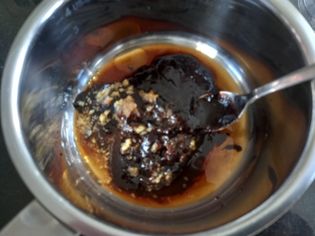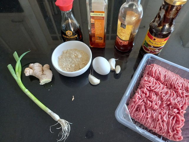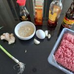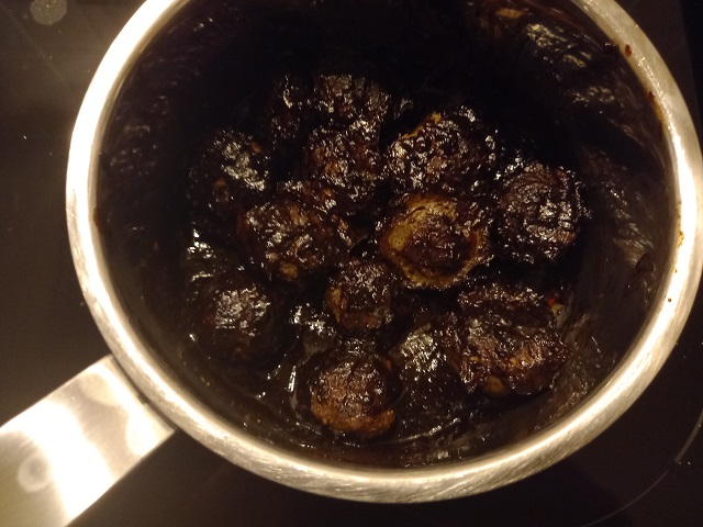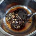 Terwijl de balletjes aan het bakken zijn meng alle ingrediënten voor de saus in een steelpannetje. Pel en snipper hiervoor het teentje knoflook en rasp de gember.