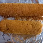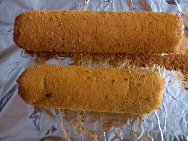 Haal de grillworsten uit de kunstdarmen. Strooi de rub op een vel aluminiumfolie en rol de worsten door de rub.