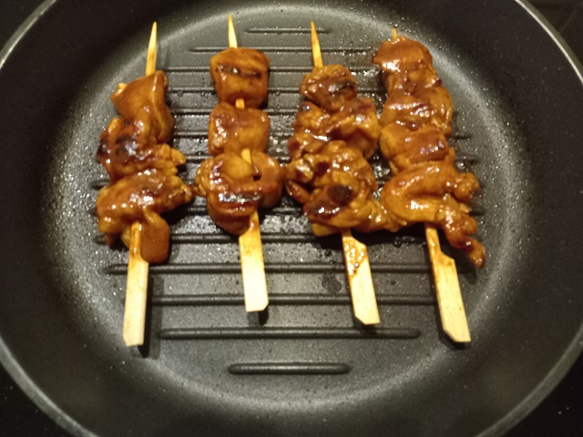 Verwarm een grillpan op middelhoog vuur en grill de spiezen. Bestrijk tussendoor met de overgebleven marinade.