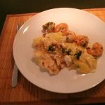 Verdeel de gratin over de borden. Ik gaf er knoflookgarnalen bij.