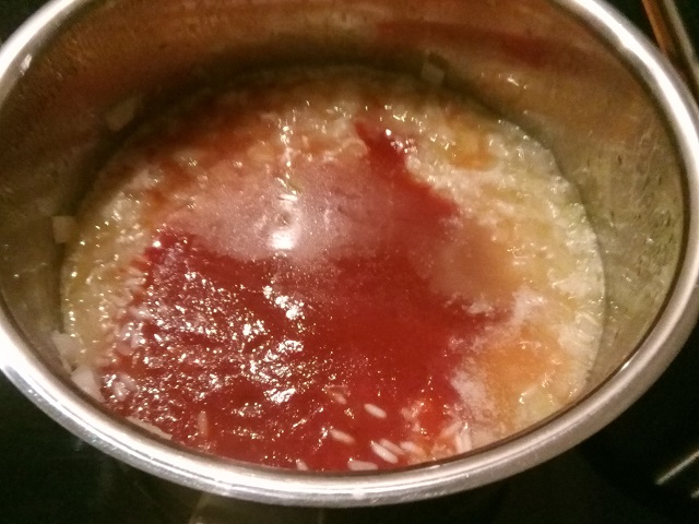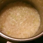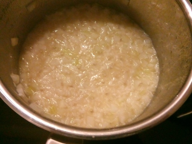 Verhit de olie in een pan en fruit hierin de ui. Zodra deze glazig is voeg dan de rijst toe en bak deze even mee. Zodra de rijst het vocht heeft opgenomen voeg dan de bouillon toe. Let wel op dat je niet te veel bouillon toevoegt! Ik had niet alle bouillon nodig.