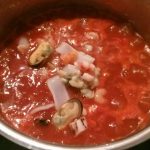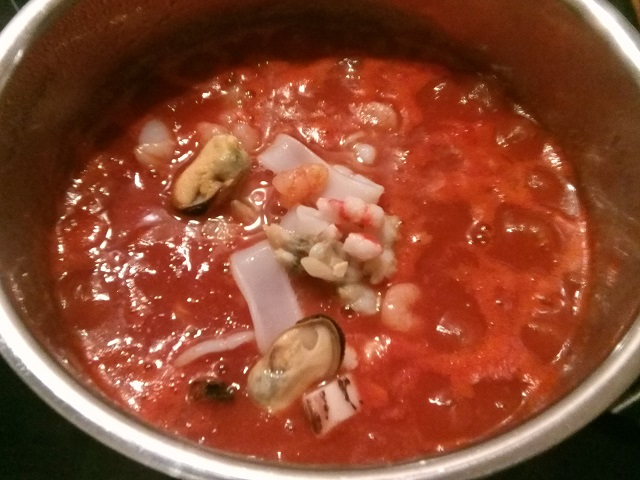 Voeg de zeevruchten toe en laat nog een minuut of 5 zachtjes pruttelen. Voeg dan de peterselie toe en breng op smaak met de chilipoeder, peper en zout.