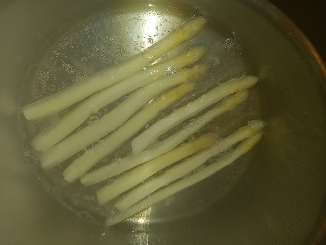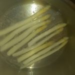 Kook de asperges in water met wat zout gedurende een minuut of 10. Spoel ze koud en droog af met keukenpapier.