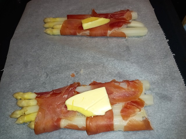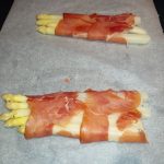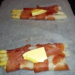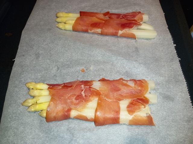 Verwarm de oven voor op 150℃ (boven en onder warmte). Wikkel de asperges in de ham en leg deze op een bakplaat bekleed met bakpapier.
