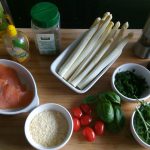 Zet alle ingrediënten klaar. Schil de asperges en snijd het droge onderste stukje van de asperges af. Snijd de bieslook, peterselie en de bieslook fijn. Snijd de kerstomaatjes door midden.