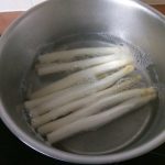 Zet de asperges op in een ruime pan met water. Voeg wat zout toe aan het water. Breng aan de kook, draai dan de warmtebron wat lager en kook de asperges in 10 à 15 minuten gaar. Prik met de punt van een mesje in de asperges om te controleren of de asperges gaar zijn. Ze moeten nog wel een beetje stevig zijn.