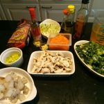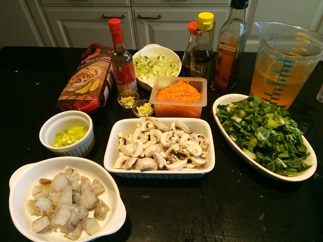 1. Zet alle ingrediënten klaar. Schil de wortel en rasp deze. Rasp de gember. Pel en snipper de knoflook. Snijd het wit van de paksoi af en snijd deze fijn. Snijd het groen van de paksoi fijn en bewaar apart. Maak de champignons schoon en snijd deze in plakjes. Snijd de garnalen in kleinere stukken. Snijd de lente ui in smalle ringetjes.