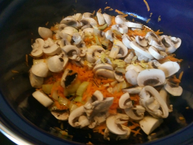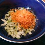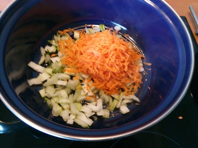2. Verhit de sesamolie in een pan op middelhoog vuur. Voeg het witte gedeelte van de paksoi toe samen met de wortel. Stoof dit gedurende 5 minuten. Voeg dan de knoflook en de gember toe en stoof dit 1 minuut mee.