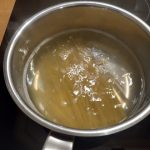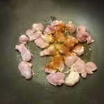 Doe de kip terug in de pan samen met de rest van de kippenbouillon en laat zachjes sudderen tot de bouillon een beetje is ingekookt.