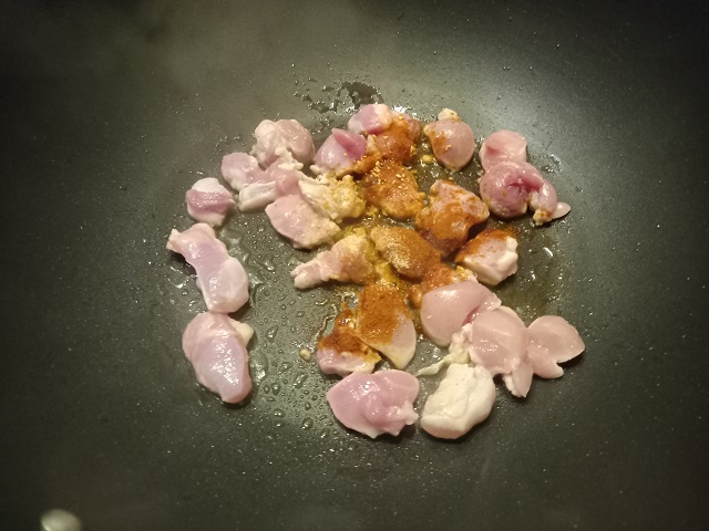 Verhit 1 el olijfolie op middelhoog vuur in een wok. Voeg de kip, paprikapoeder, uienpoeder knoflookpoeder en wat zout en peper toe. Bak fit tot de kip licht gekleurd is. Haal uit de pan en bewaar op een bordje.