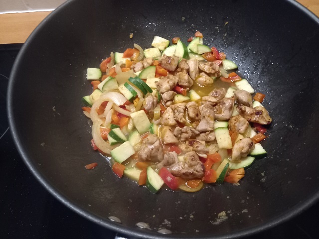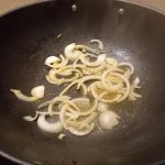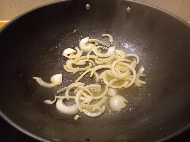 Voeg eventueel nog een beetje olie toen en voeg de ui en een klein beetje kippenbouilon toe om te wok te deglaceren. Bak tot de ui doorzichtig en zacht is.