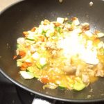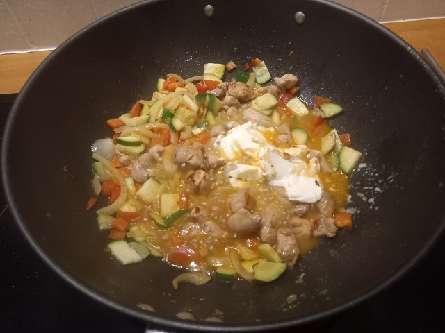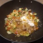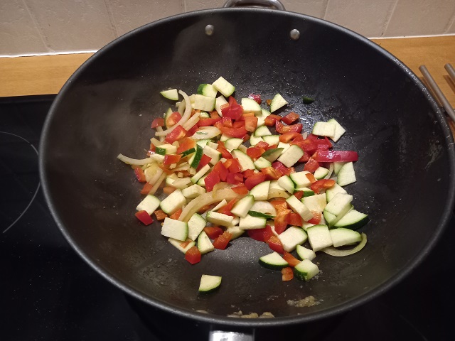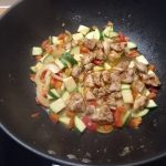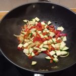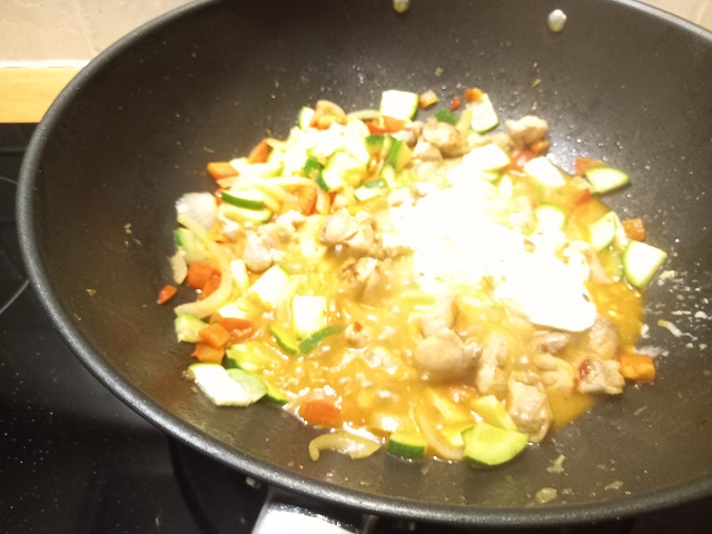 Voeg de parika en decourgette blokjes toe. Roer het geheel door elkaar.