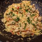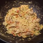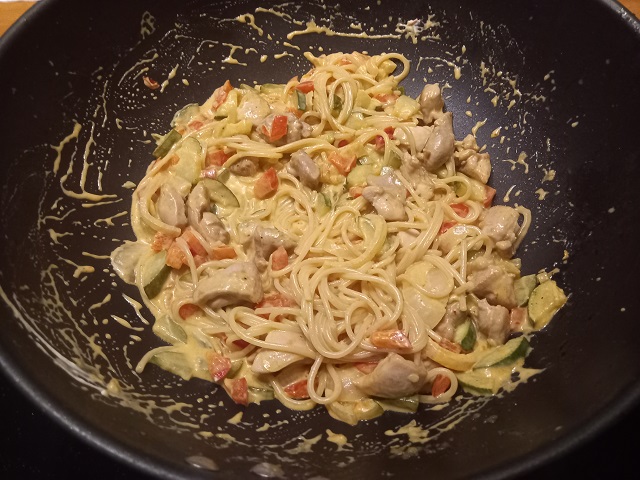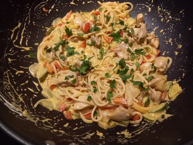 Heerlijke Bang Bang Kip Pasta – zachte stukjes kip, met paprika en courgette in een pittige saus en de pasta hier doorheen geroerd.
