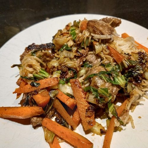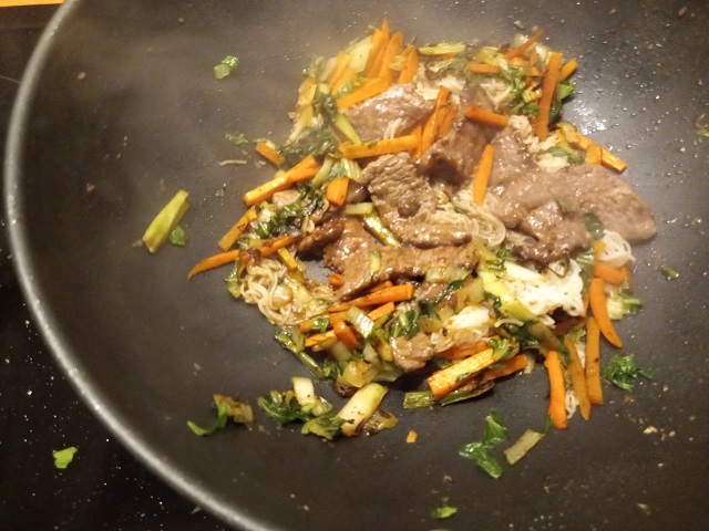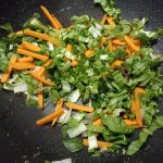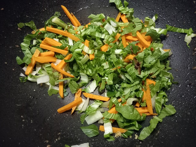Verhit de andere el. olie in dezelfde wok en bak het witte gedeelte van de lente ui, knoflook en gember. Roerbak dit gedurende 30 seconden op midden hoog vuur.Voeg dan de worten en de paksoi toe en roerbak dit 3-5 minuten tot de groenten gaar zijn maar nog wel een beet hebben.