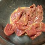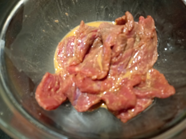 Meng de maïzena, sojasaus en de Shaoxing wijn in een kom. Voeg de plakjes biefstuk toe en meng. Laat marineren terwijl je de andere ingrediënten voorbereidt.