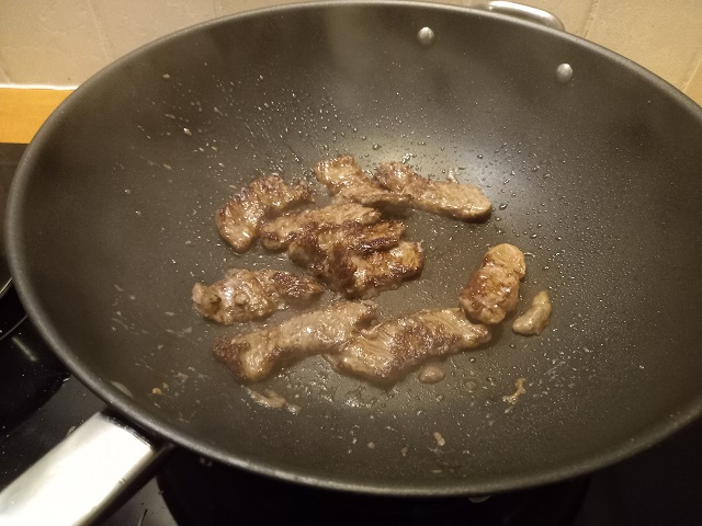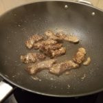 Verhit 1 el olie in een wok. Bak de plakjes biefstuk op hoog vuur een minuut of 5-7 afhankelijk van de dikte. Haal uit de wok en bewaar op een bordje.