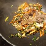 Voeg de noedels, het groene deel van de lente ui en de biefstuk toe aan de pan. Meng door elkaar. Giet de saus over het gerecht en warm nog even door. Verdeel over de borden en garneer met de sesam zaadjes.