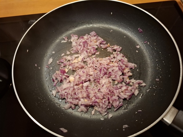 Verhit op middelhoog vuur de olie in een koekenpan en fruit de ui tot deze glazig ziet.