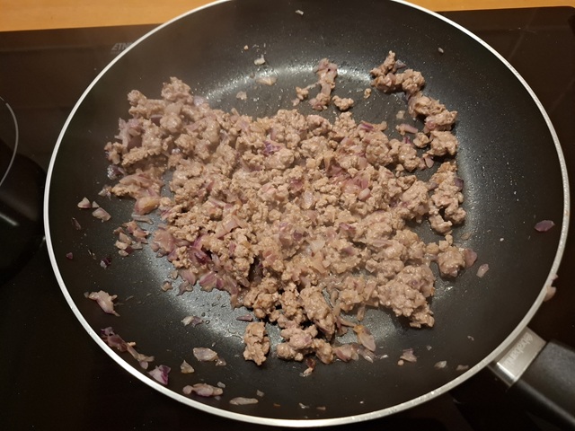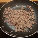Voeg het gehakt toe en bak deze rul met behulp van een pollepel. Voeg de knoflook toe en bak deze een halve minuut mee.