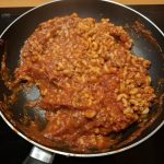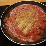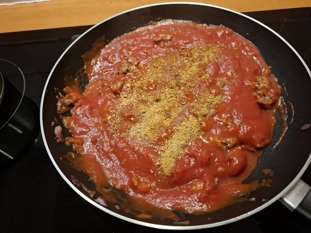 Voeg de tomatensaus en het kruidenmengsel toe. Laat dit 20 minuten zachtjes sudderen.