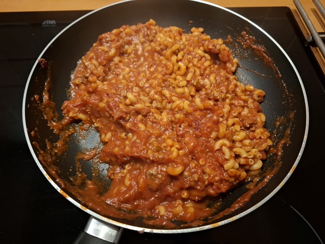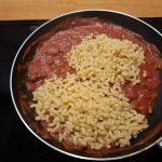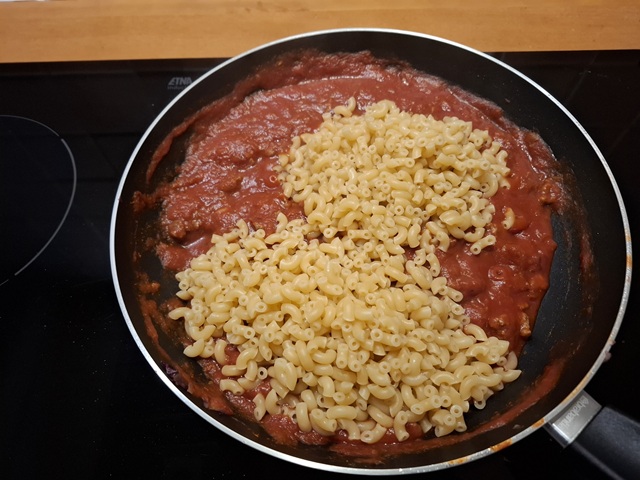 Kook intussen de macaroni volgens aanwijzingen op de verpakking. Giet deze af maar spoel deze niet af.