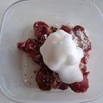 1. Meng in een kom het vlees met het bakpoeder, witte peper, sojasaus, maïzena en de helft van het opgeklopte eiwit. Zet gedurende 30 minuten in de koelkast.