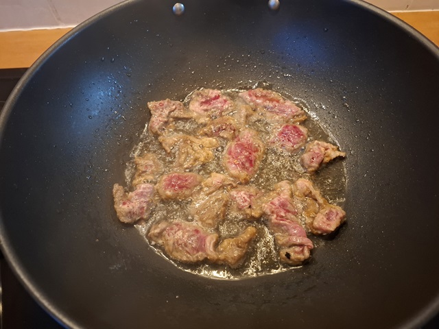 3. Verhit 5 à 6 el. arachideolie in een wok tot 175℃. Haal het vlees uit de koelkast en bestuif het met maïzena. Wok het vlees tot het mooi goudbruin is. Haal dan het vlees uit de wok en bewaar op een bordje.