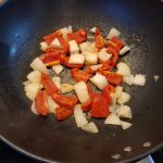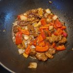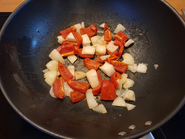 5. Wok de paprika en uienstukjes gedurende een minuut of 2..