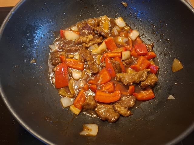 6. Voeg het vlees toe met de azijn en de saus en meng goed door elkaar. Maak een papje van de maïzena en het water en voeg dit toe. Roer een minuutje door zodat de saus wat dikker wordt.