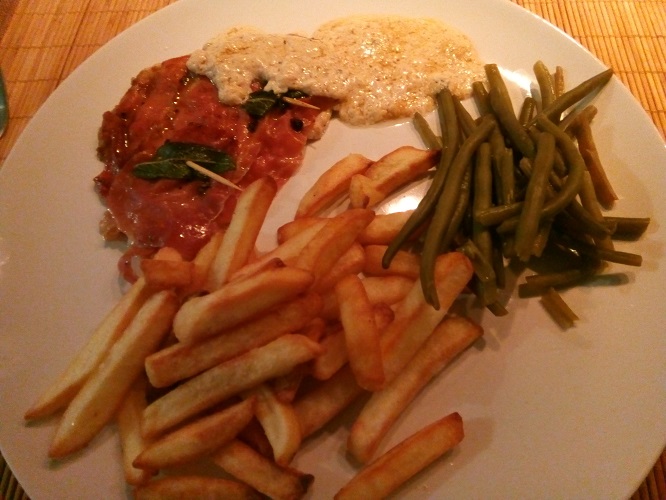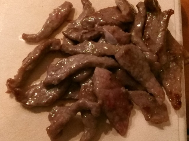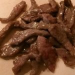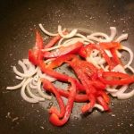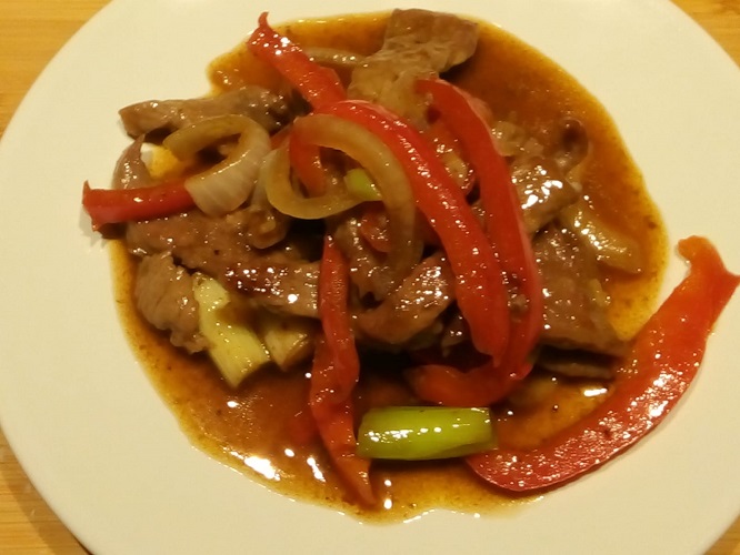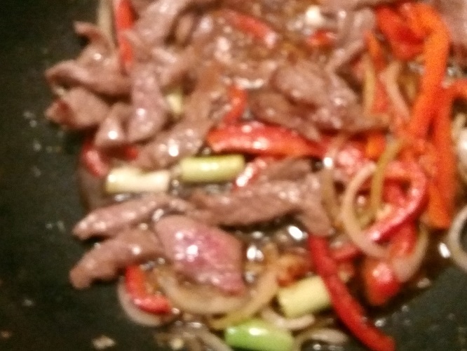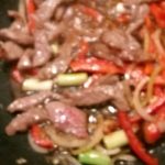 Biefstuk reepjes geroerbakt met paprika en ui in een saus