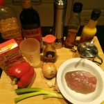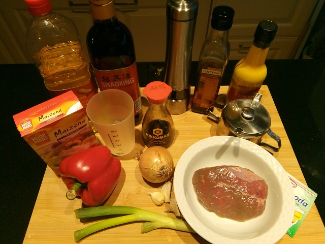 1. Zet alle ingrediënten klaar. Pel de ui en knoflook. Snijd de ui in halve ringen. Maak de paprika schoon en snijd deze in smalle reepjes. Snipper de knoflook. Snijd de biefstuk dwars op de draad in reepjes. Snijd de lente ui in stukjes van 2 cm.