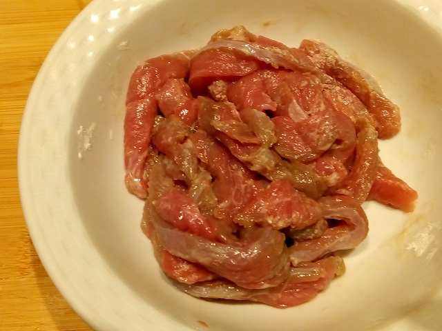 3. Doe de reepjes in een diepbord en voeg 1 el. van de roerbaksaus toe. Meng goed door elkaar. Voeg de bak soda en maïzena toe. Meng goed door elkaar. Laat het vlees nu 10 minuten rusten.