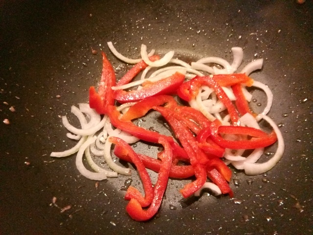 5. Verhit de andere el. olie en roerbak de ui en paprikareepjes. Als de paprika wat zachter is geworden voeg dan de stukjes lente ui toe en schuif dan het geheel naar 1 kant van de pan. Indien er nog genoeg olie over is fruit hierin dan de knoflook en de geraspte gember. Voeg anders nog een klein scheutje olie toe. Fruit dit 1 minuut en meng dan met het ui-paprikamengsel.