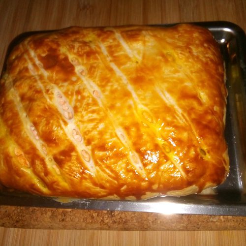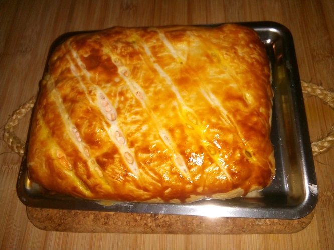 Rol het deeg uit op een snijplank. Leg in het midden de zalm. Daarop het champignon-garnalenmengsel. Vouw het deeg dicht en druk goed de naden aan. Meng de eidooier met de koffiemelk en bestrijk hiermee het bladerdeegpakketje met behulp van een kwastje. Maak met behulp van een mesje wat streepje op het bladerdeeg, maar zorg er wel voor dat je niet door het deeg heen snijd. Bak het pakketje gedurende 20 à 25 minuten. Zodra het deeg een mooi kleurtje heeft haal je het uit de oven en verdeel je het over de borden.