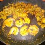 Schuif de champignons wat opzij en bak de garnalen aan beide kanten mooi roze. Voeg tijdens het bakken de paprika, kurkuma en de crème fraïche toe. Verwarm de oven voor op 180°.