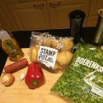 Zet alle ingrediënten klaar. Pel en snipper de ui. Schil de aardappelen en snijd in stukken. Haal de zaadlijsten uit de paprika en snijd deze in blokjes. Haal het vel van de chorizo en snijd in plakjes en daarna in stukjes.
